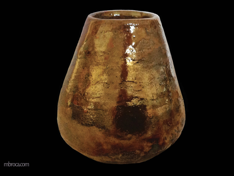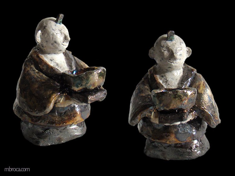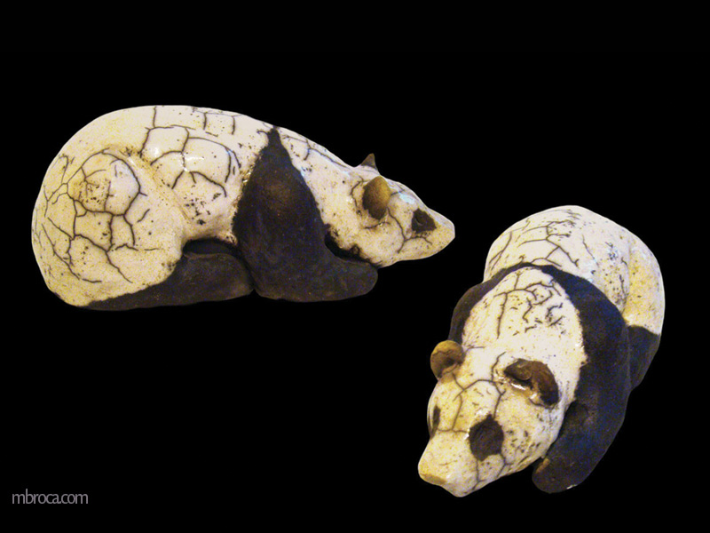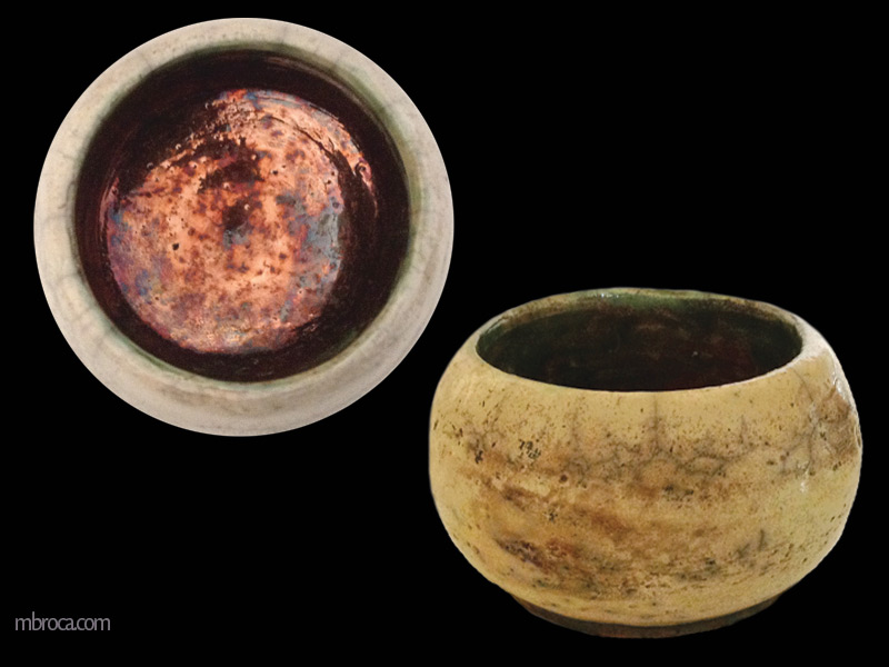 Le raku est une céramique japonaise, à l’origine utilisée pour la cérémonie du thé. Il y a une première cuisson normale, puis les pièces émaillées sont sorties du four vers 980 ° lors de la deuxième cuisson. Cela crée un choc thermique et en conséquence, craquelle l’émail. Les pièces sont mises dans un combustible (sciure, tissus…) qui s’enflamme puis fait réagir l’émail. On enferme ensuite les pièces afin de les priver d’oxygène et de produire du CO2. Celui-ci se dépose dans les craquelures, réalisant notamment les écritures typiques du raku.