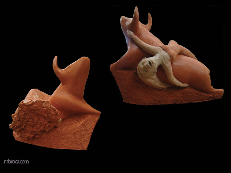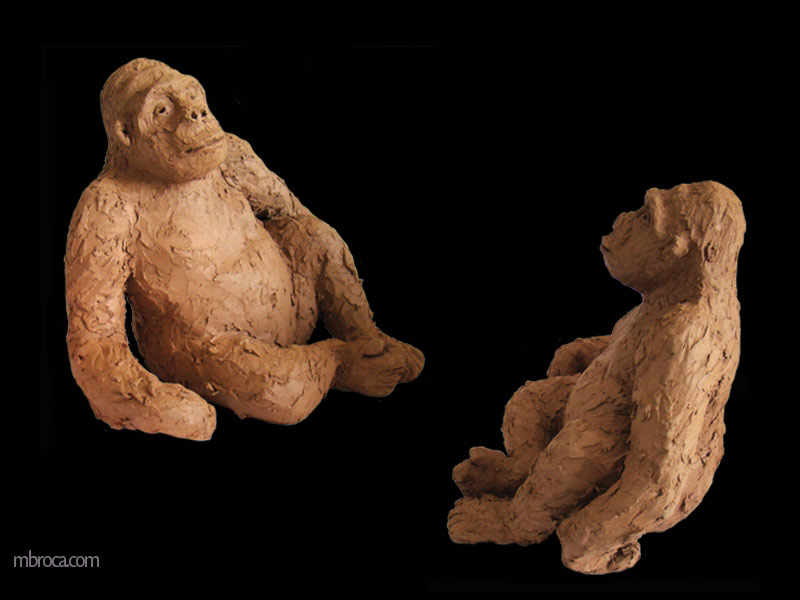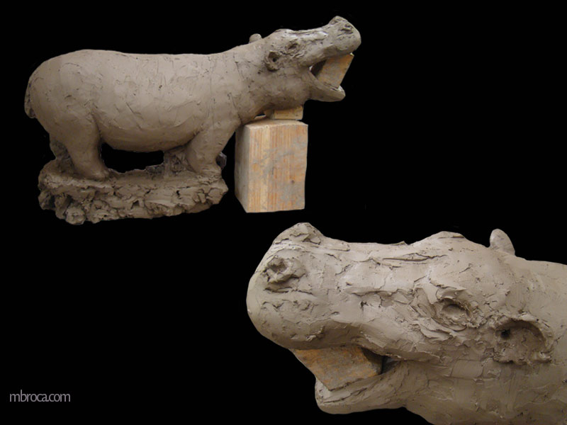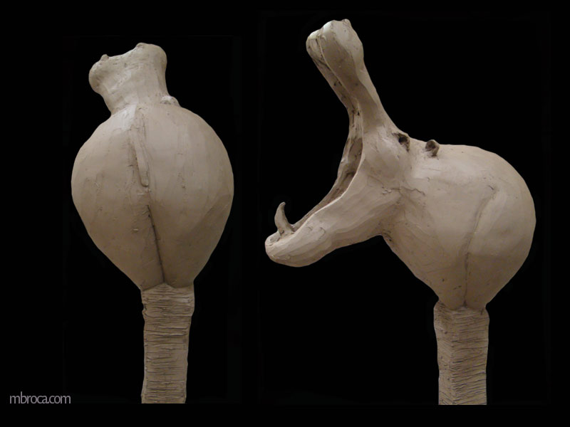Étude de l’hippopotame, réaliste, stylisé et hybride, 50 cm de haut, d’après des photographies. Réalisés lors de mes études, eux aussi détruits le soir de leur réalisation. Totem de cochon d’Inde, gorille et tatou.