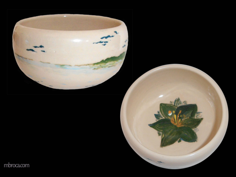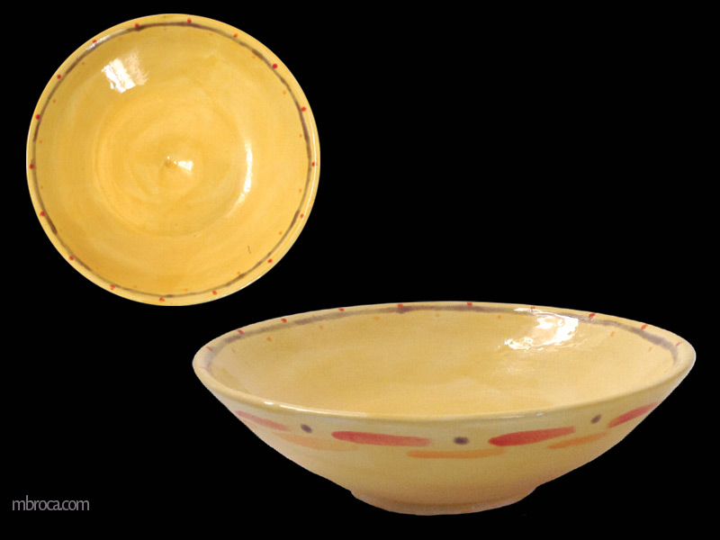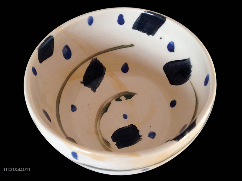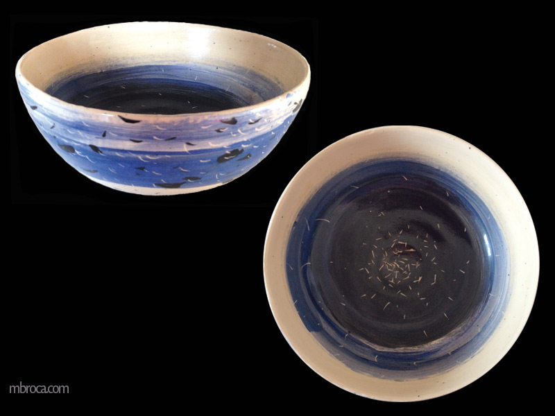 La faïence est une sorte d’argile, comme le grès ou la porcelaine le sont aussi. Je l’utilise pour réaliser des pièces minutieuses, des bols, des bas reliefs, des modelages et aussi des sgraffites. Lors de la première cuisson je peux ajouter de l’engobe (terres colorées), puis à la seconde cuisson je peux ajouter l’émail, transparent ou coloré.