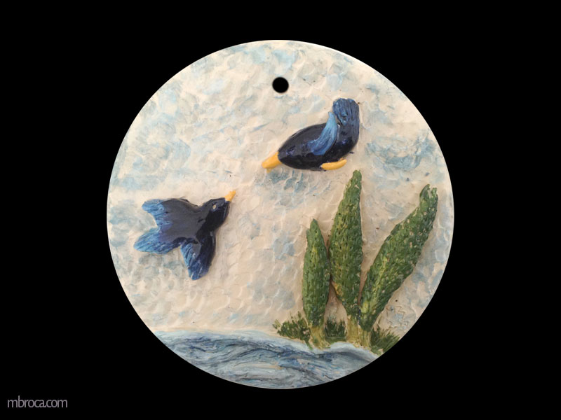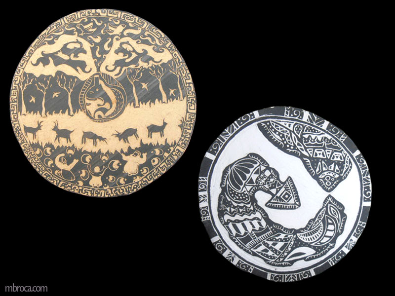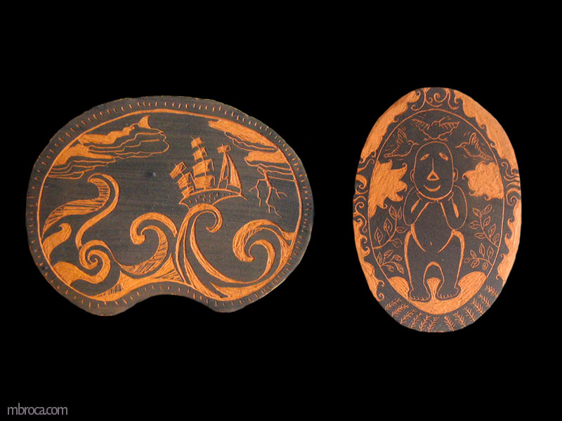 Les sgraffites sont des plaques de terre de couleur (rose, rouge ou blanche), que je recouvre ensuite d’engobe d’une autre couleur (noire en général). Enfin quand la plaque est sèche (mais pas cuite), j’égratigne la couche d’engobe pour faire apparaître la couleur sous-jacente.