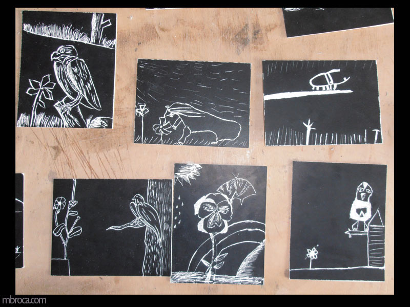 Cette technique consiste à graver une matrice, à l’encrer puis à l’imprimer autant de fois que voulu. Pour la taille douce, les traits gravées soit dans du métal, soit du plastique, soit des boîtes de tétra-pack, s’imprimeront sur le papier. Des enfants de primaire peuvent découvrir cette technique mais sous la surveillance accrue d’adultes.