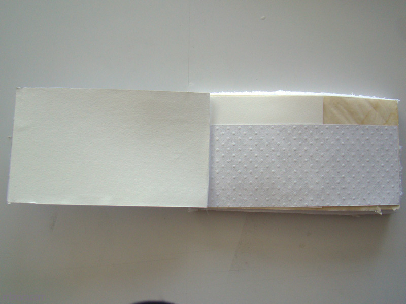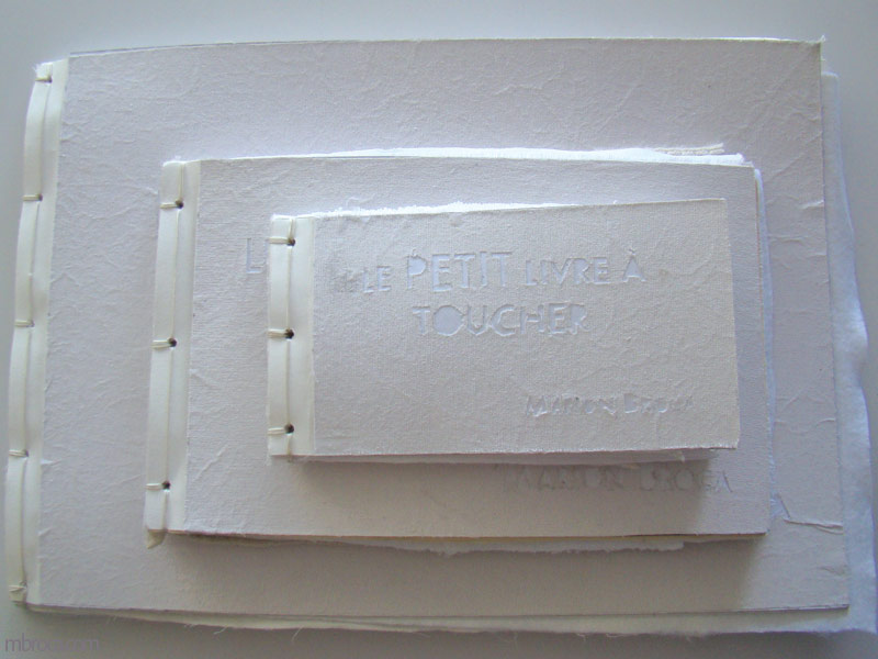 Ces trois livres sont composés de feuilles de papier, tissus, cartons tous blancs. J’ai utilisé une reliure japonaise. Il n’y a rien à lire, juste des pages brutes. Et comme l’indiquent les titres, le lecteur doit toucher les pages. Cela se rapporte aux livres pour les mal et non voyants comme la maison d’édition Les doigts qui rêvent. Mais aussi les prélivres de Bruno Munari, 1980.