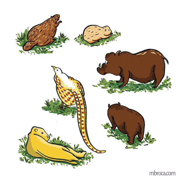 Recherches ou illustrations abouties, voici quelques dessins mettant en scène des animaux, notamment une marmotte obèse (ça existe) feutres, encres, aquarelle, infographie.