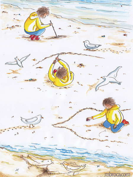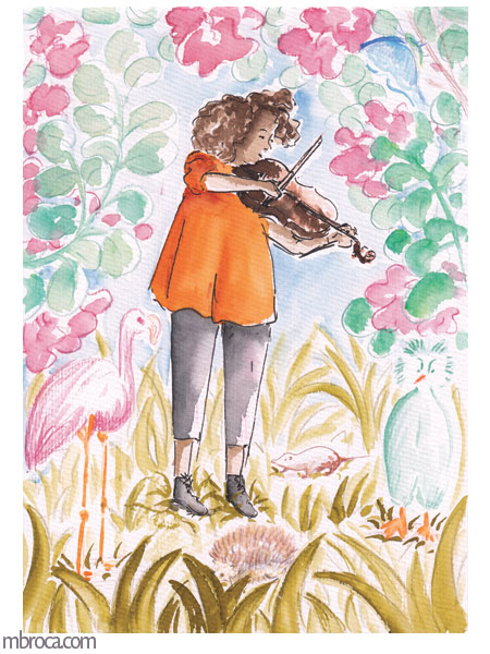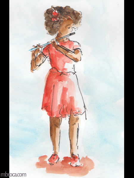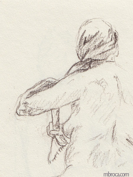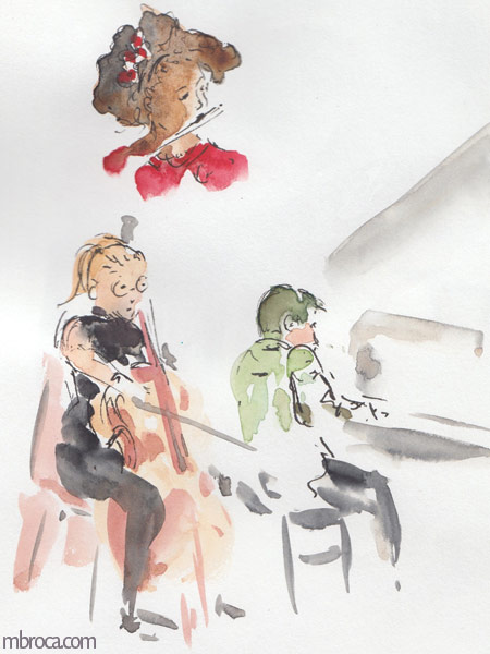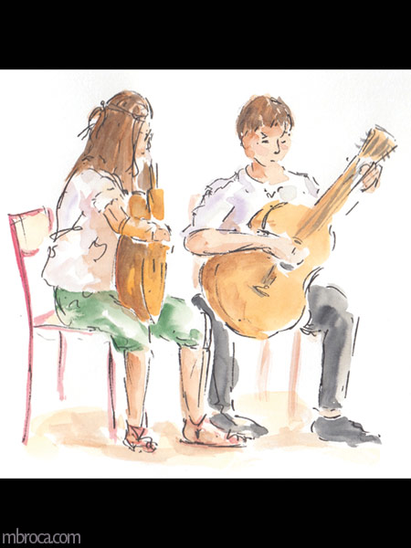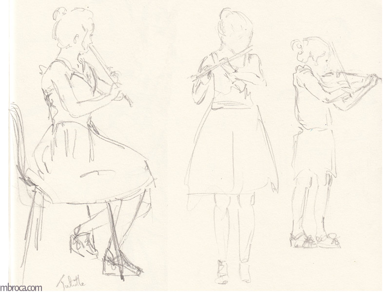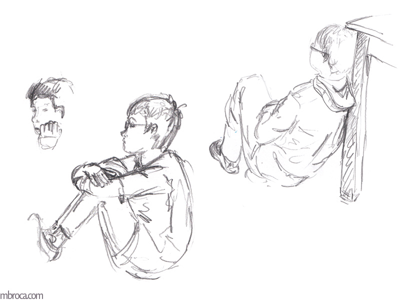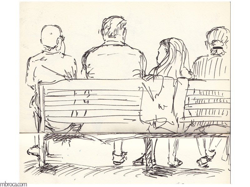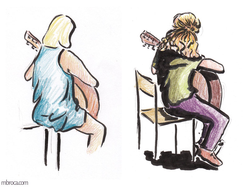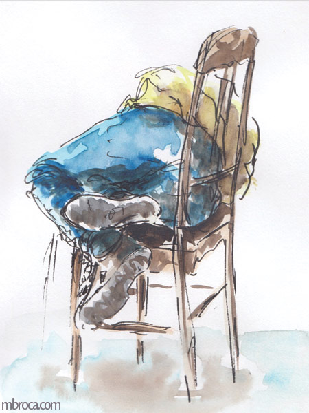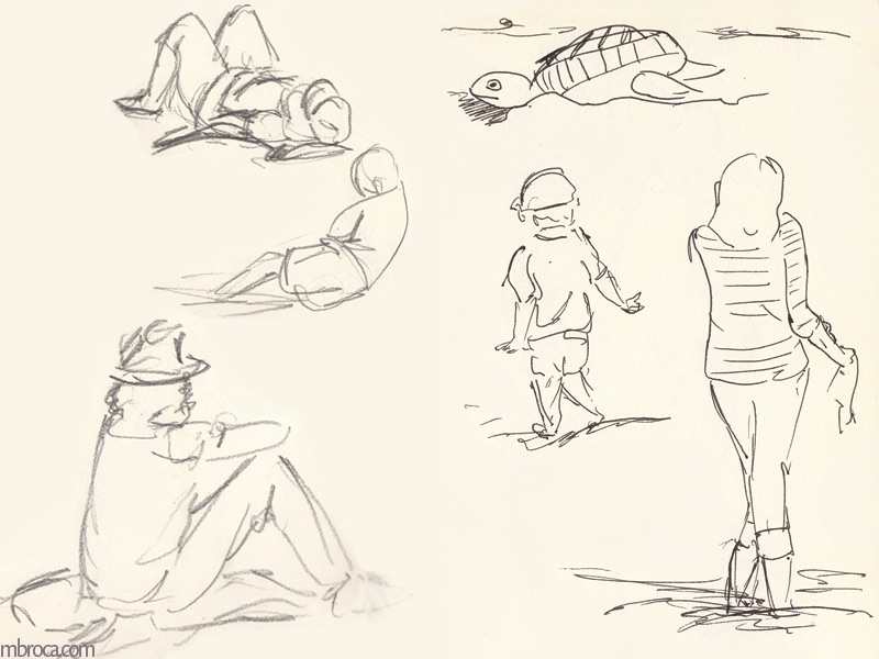 Parfois les gens sont immobiles pendant quelques minutes me permettant de les dessiner, mais souvent l’instinct prend le dessus et ils bougent, se sentant observés (crayons, crayons de couleurs et aquarelle). J’en explique plus sur le fait de croquer les gens dans cet article de blog : Croquis sur le vif : les concerts.