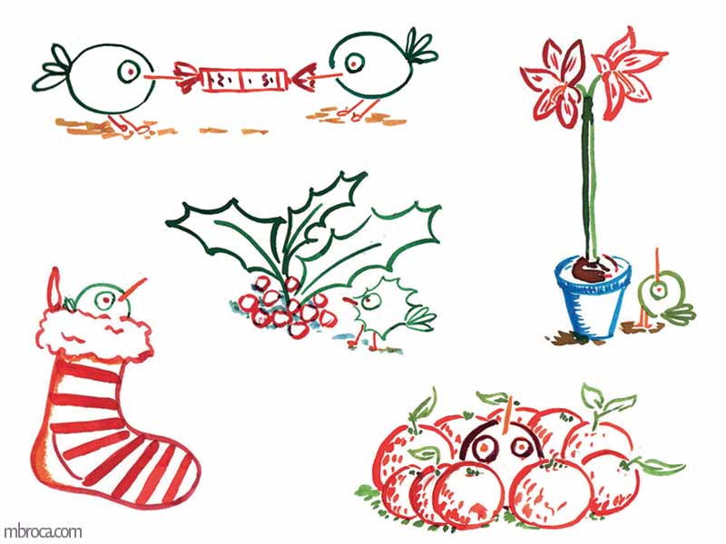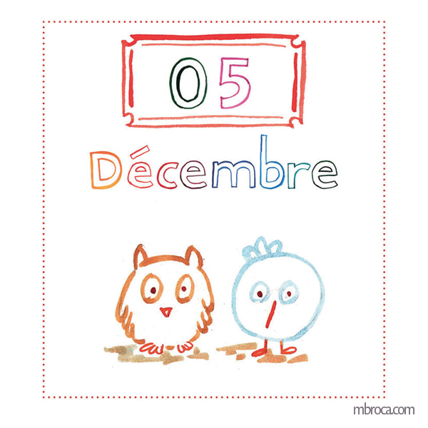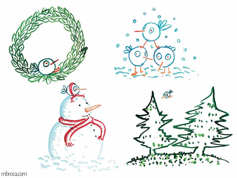 Illustrations sur les oiseaux ayant donné lieu ensuite à un calendrier de l’Avent, encres.
