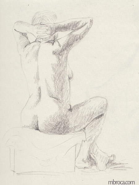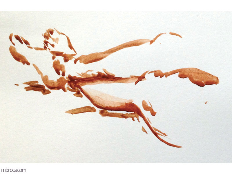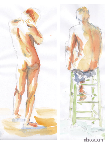Modèles vivants réalisés en 10 à 20 minutes selon les poses, crayons, aquarelle, encres, mais aussi sépia. J’ai écris un article de blog sur le sujet : Nus : de la note au plaisir de dessiner.