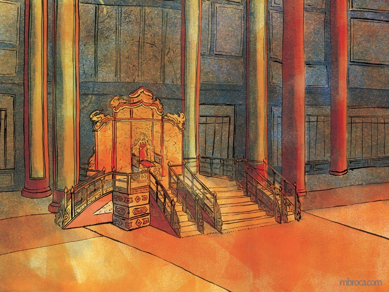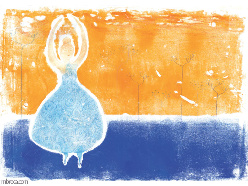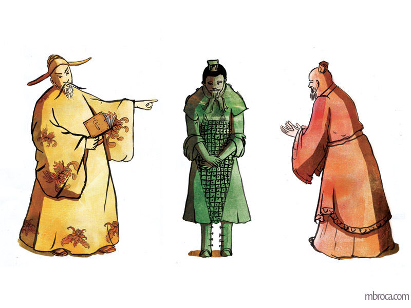 Illustrations et recherches, notamment décors et personnages : Le rossignol et l’Empereur de Chine, encre de chine et monotype.