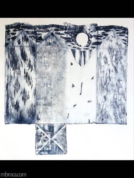 Gravures tailles douces dans du plastique, du carton ou du métal, ensuite imprimées sur papier. Les gribouillages, Bridge et textures, (réalisé lors d’un stage à l’école d’arts du Grand Narbonne, selon le travail d’Anna Sobierajski), village.