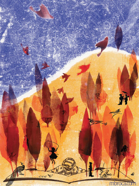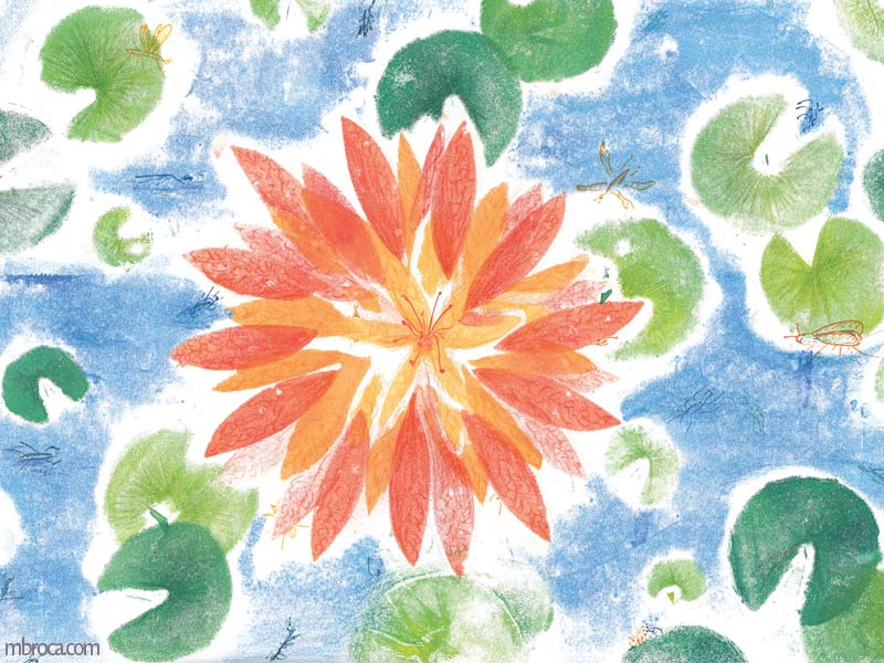 Illustrations diverses à partir de monotypes, pour certaines retravaillées ensuite à l’encre, aux crayons de couleurs, ou par informatique. Le monotype est une technique de gravure qui consiste à étaler de l’encre sur une surface plastique puis à l’appliquer sur un papier. Chaque tirage est unique, car il n’y a pas de matrice comme dans les autres formes de gravure.